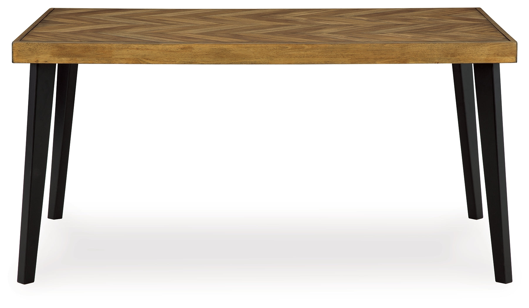 - Inlay tabletop with plank effect in chevron pattern; black tapered legs