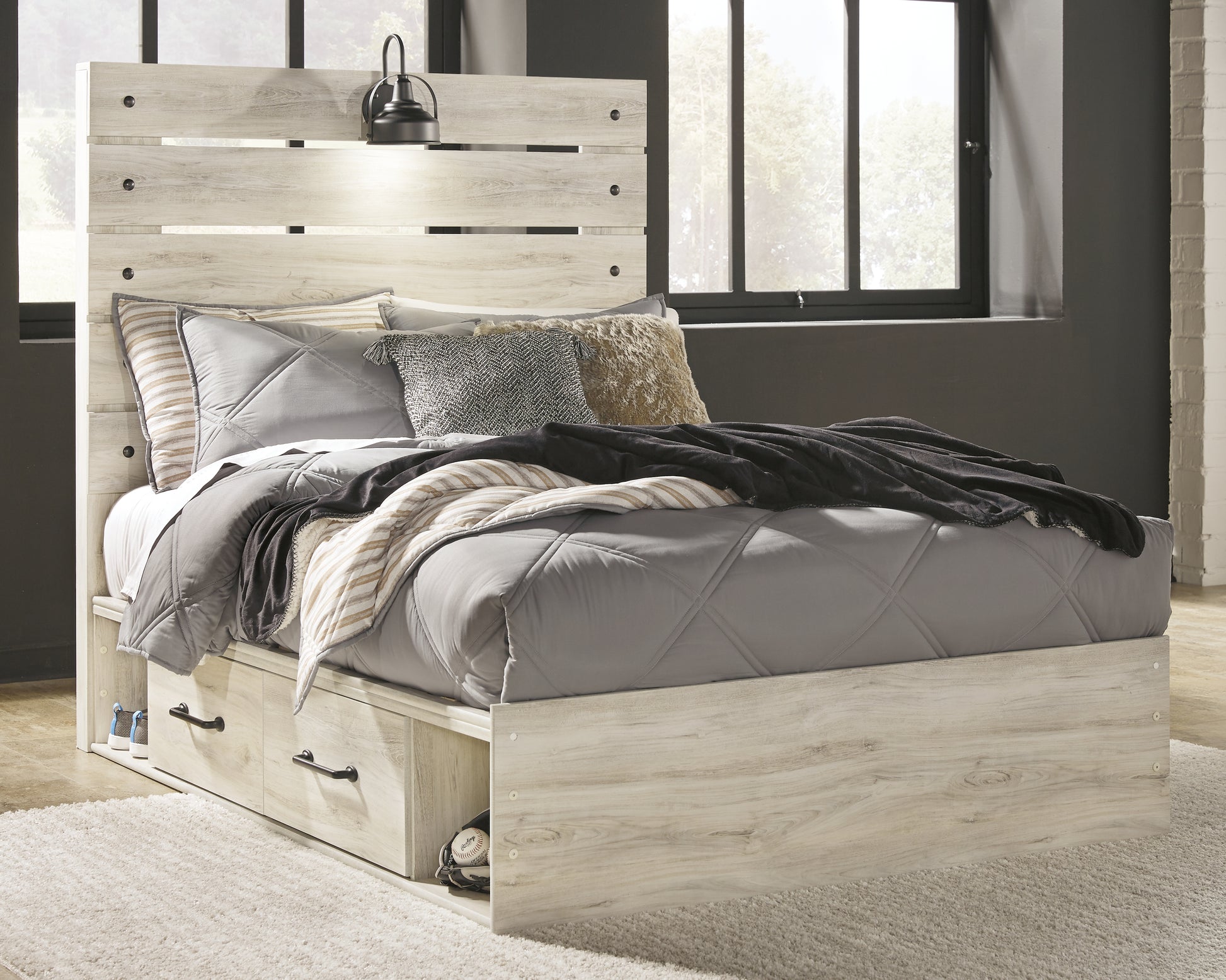 What a delightful take on rustic industrial style. Whether modern loft or modern farmhouse, this king panel storage bed makes itself at home. The wispy whitewash palette enhances without covering the grain for that weathered look you crave. Love to read in bed? You’re sure to find the retro-chic light sconces and USB plug-ins on the open-slat style headboard such a bright idea. Elongated drawer pulls on the under bed storage drawers elevate the aesthetic.