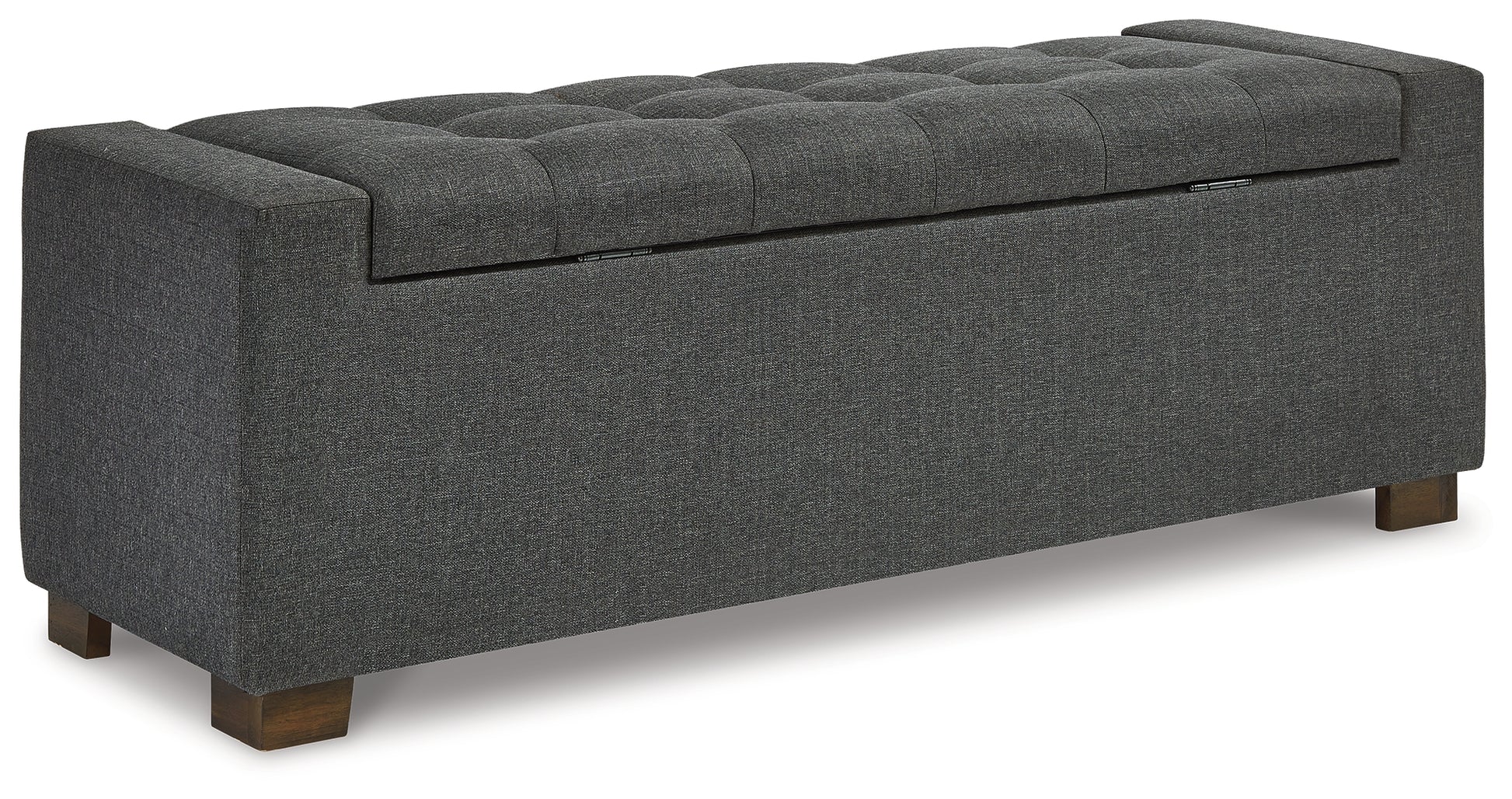 Whether gracing a front entry or living room, or placed at the foot of the bed, this upholstered storage bench is loaded with flair. Tufted cushioned seat with hinge reveals an ample storage compartment for this, that and the other. Gorgeous gray fabric is the epitome of neutral sophistication.