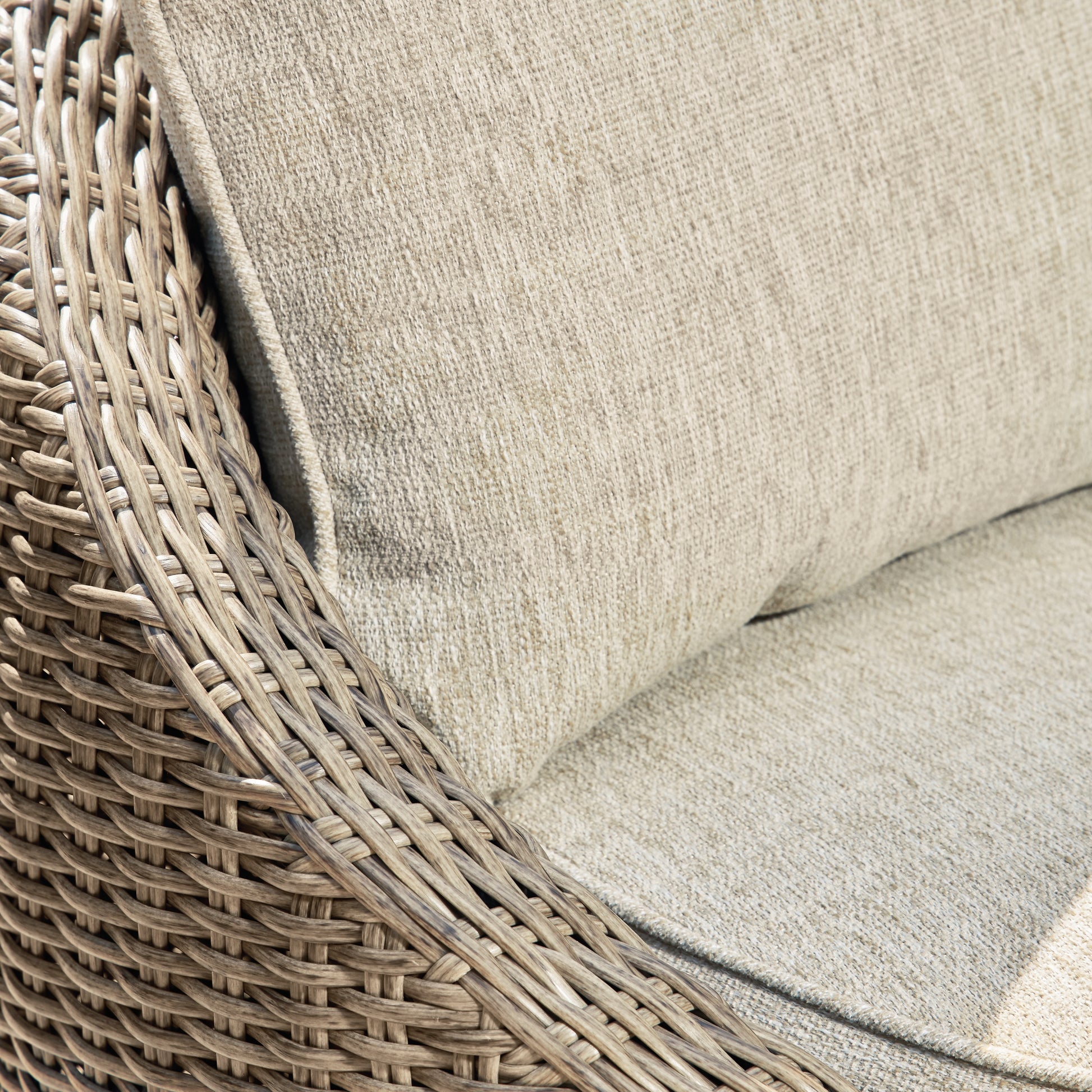 This swivel lounge chair completes your outdoor seating area with its fresh take on casual comfort. Handwoven resin wicker over a curving aluminum frame balances streamlined style and exceptional durability. High-performance beige Nuvella+™ fabric wraps the seat and back cushions, protecting against the natural elements.