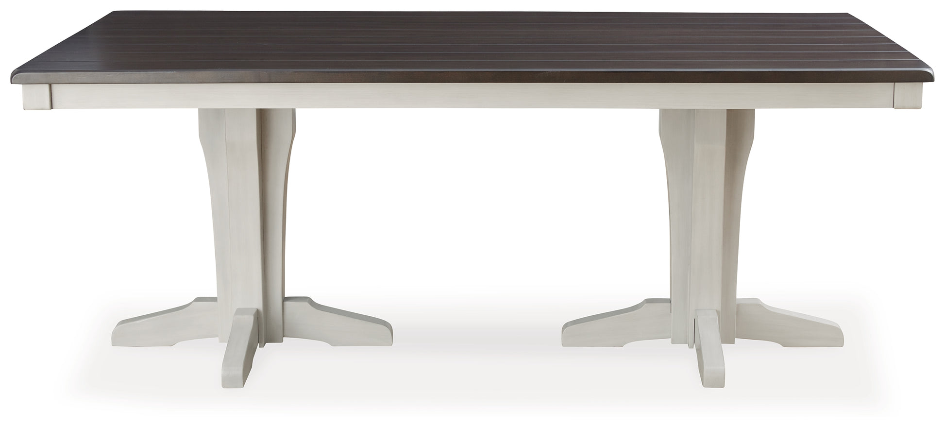 Make a farmhouse-inspired statement with this dining table. Its clean two-tone finish, pedestal base and planked effect bring the charm of the countryside to your dining room. Pair it with other pieces in the collection to complete a casual lifestyle look in your home.