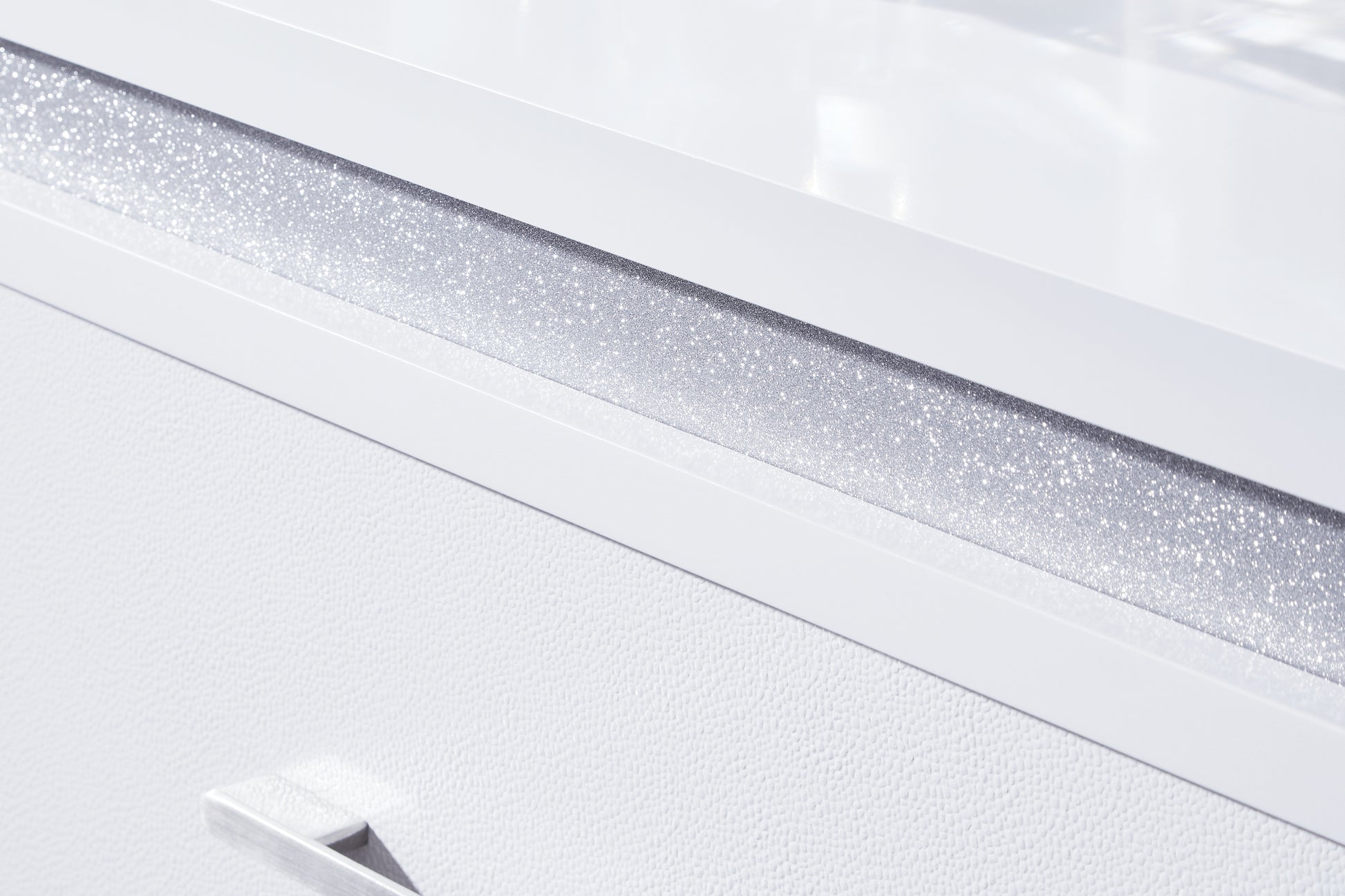 This king upholstered panel bed is a showstopper, bringing a touch of modern glamour to your sanctuary. A sleek white finish, paired with the cushioned headboard’s off-white fabric with metallic silver accent threads, creates a sophisticated feel. Built-in LED lighting adds a soft glow, making it even easier to get ready in the morning or wind down at night. It’s a simply stunning way to achieve the bedroom of your dreams.