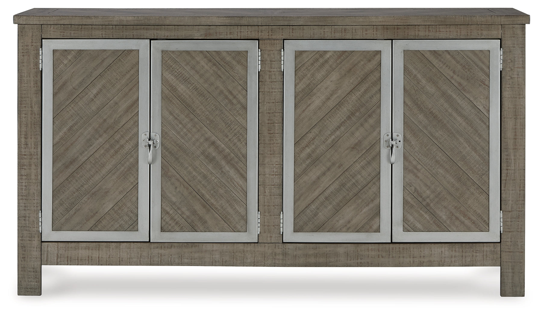 - Wood and metal base with weathered gray finish