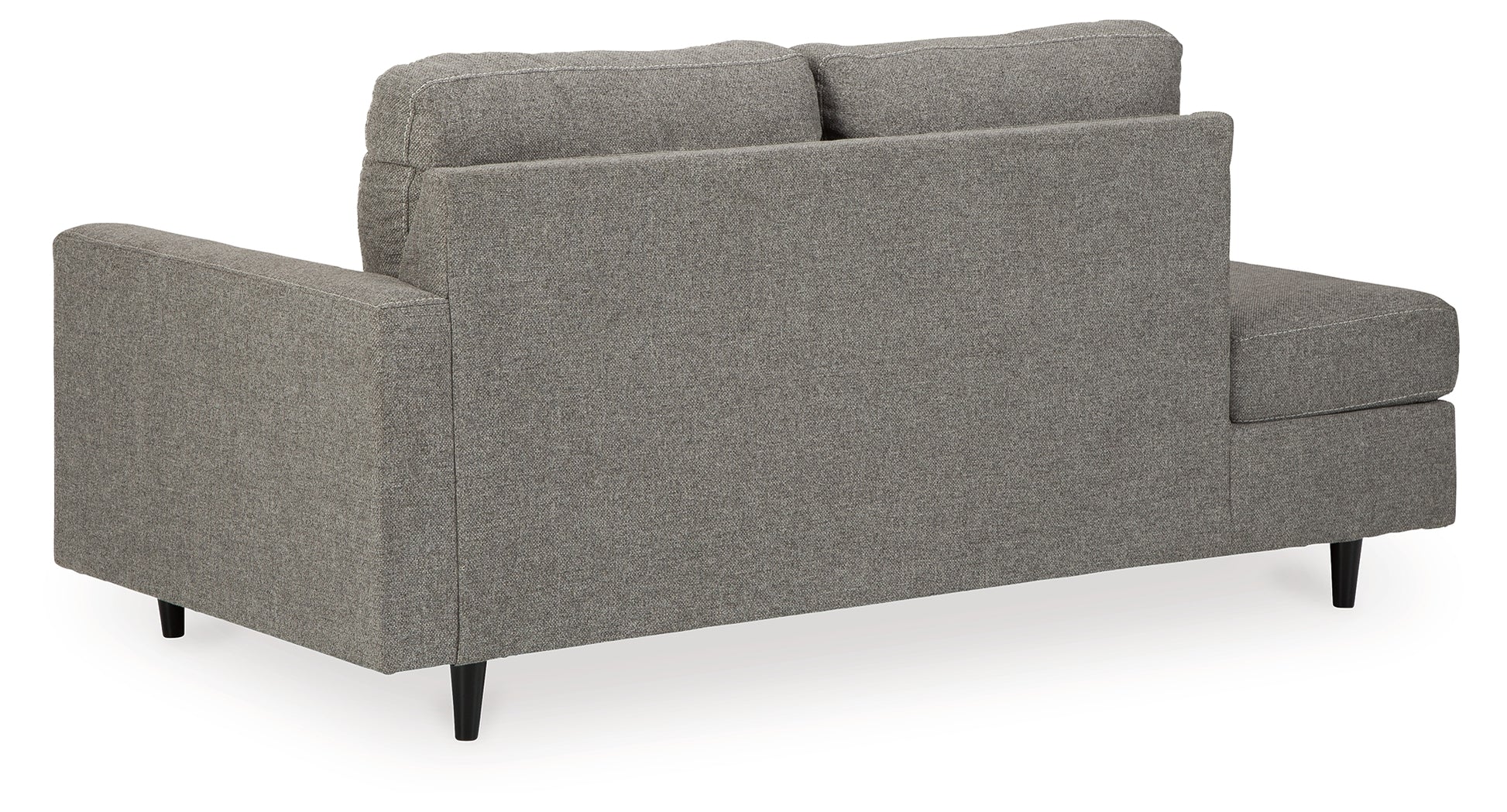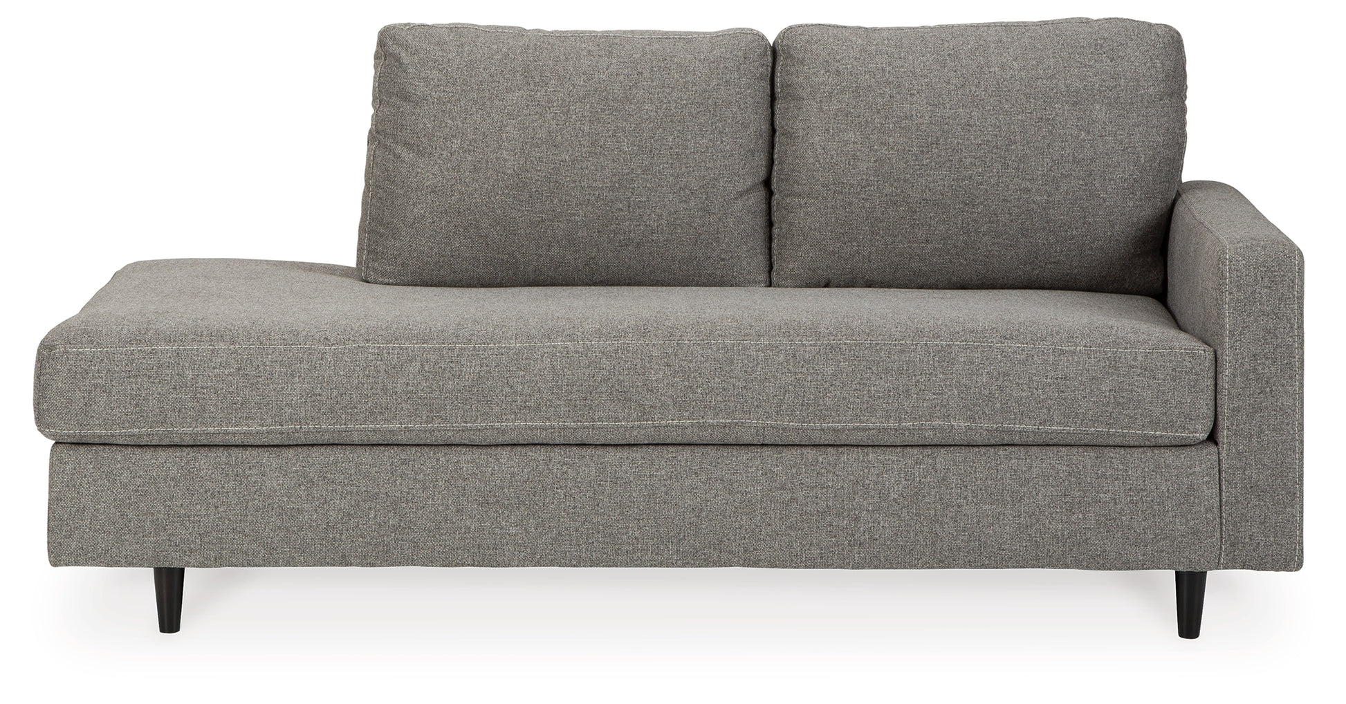 Mixing mid-century inspiration with modern attitude, this right-arm facing chaise is as retro chic as it is fashion forward. Loaded with multi-tonal interest, the granite gray upholstery is the essence of earthy elegance. Design elements include slim track arms and tapered accent legs that are right on point.