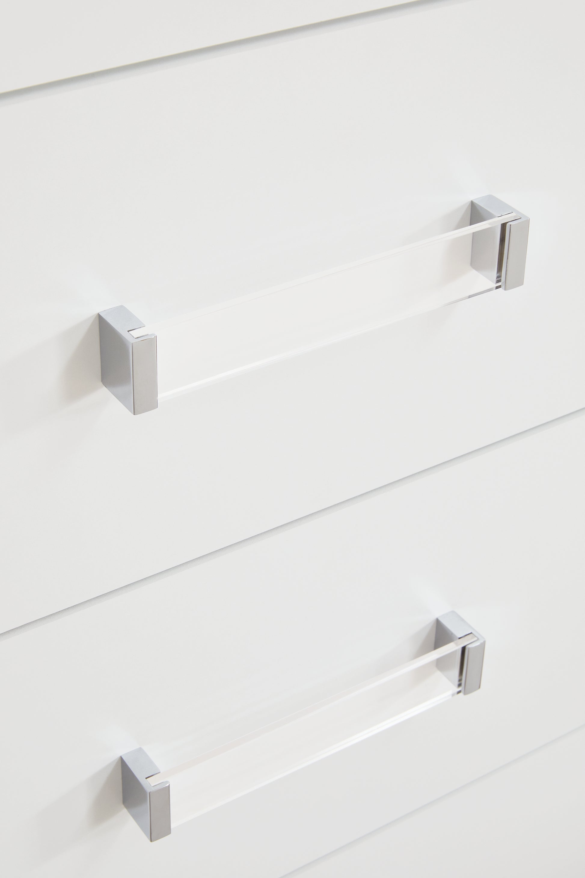 - Acrylic and chrome-tone drawer handles