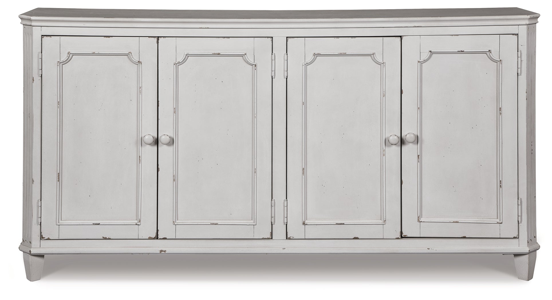 Put your love of shabby chic style on display with this wonderfully versatile cabinet. Adding to the charm of its distressed vintage paint finish: glass-inlay doors with a “free form” lattice design that’s delightfully different. Adjustable shelved storage is abundantly practical, be it in a dining room, living room or entryway.