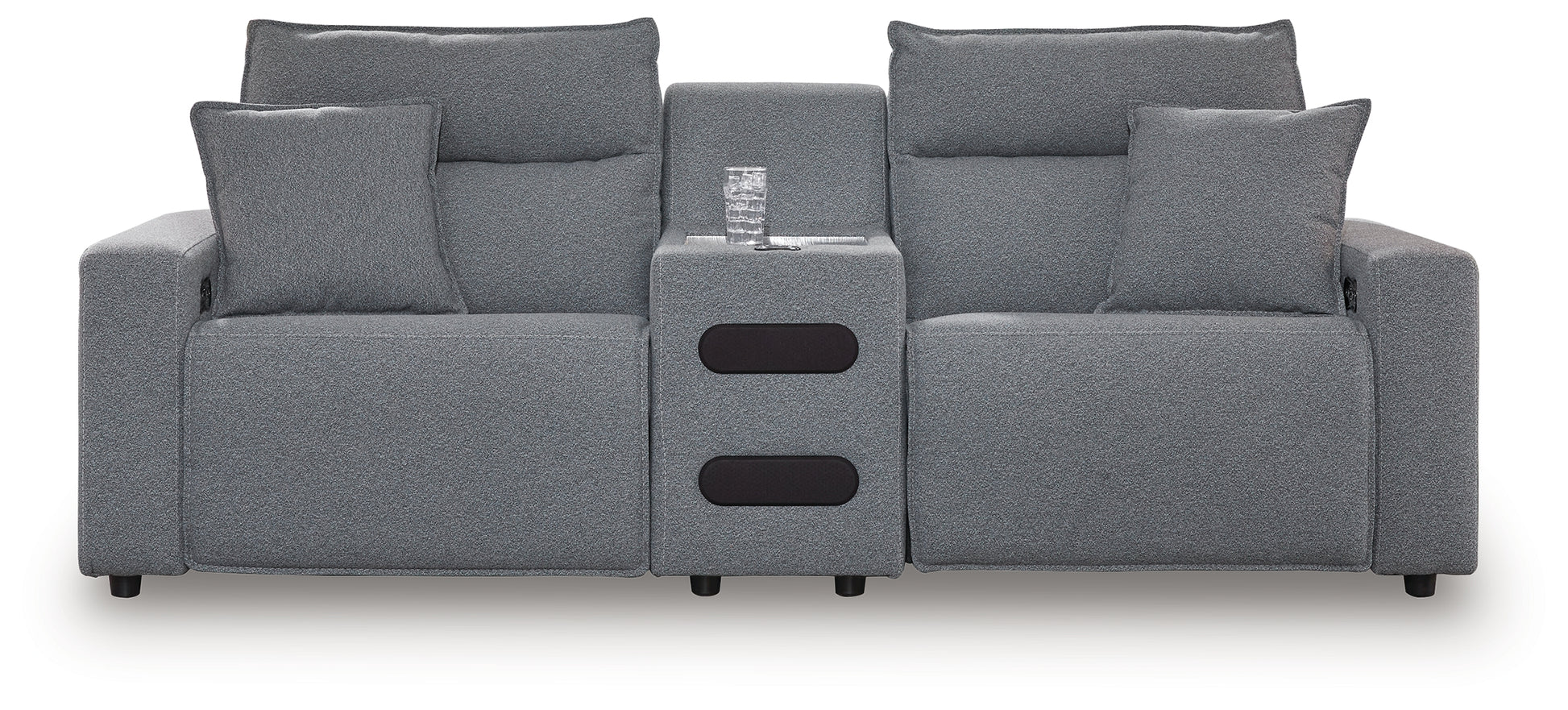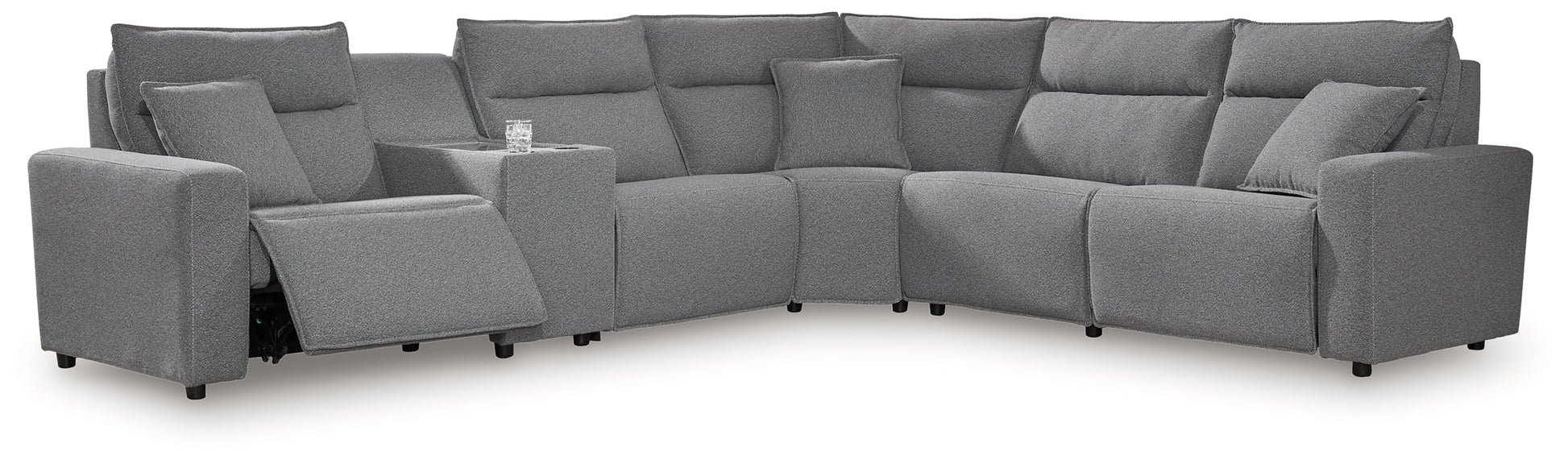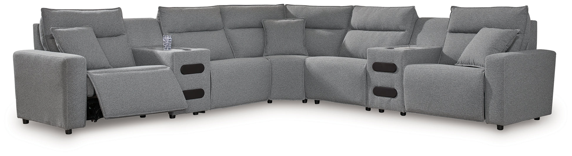 - Includes 7 modular pieces: left-arm facing power recliner, power armless recliner, armless chair, 2 consoles with audio systems, wedge and right-arm facing power recliner
