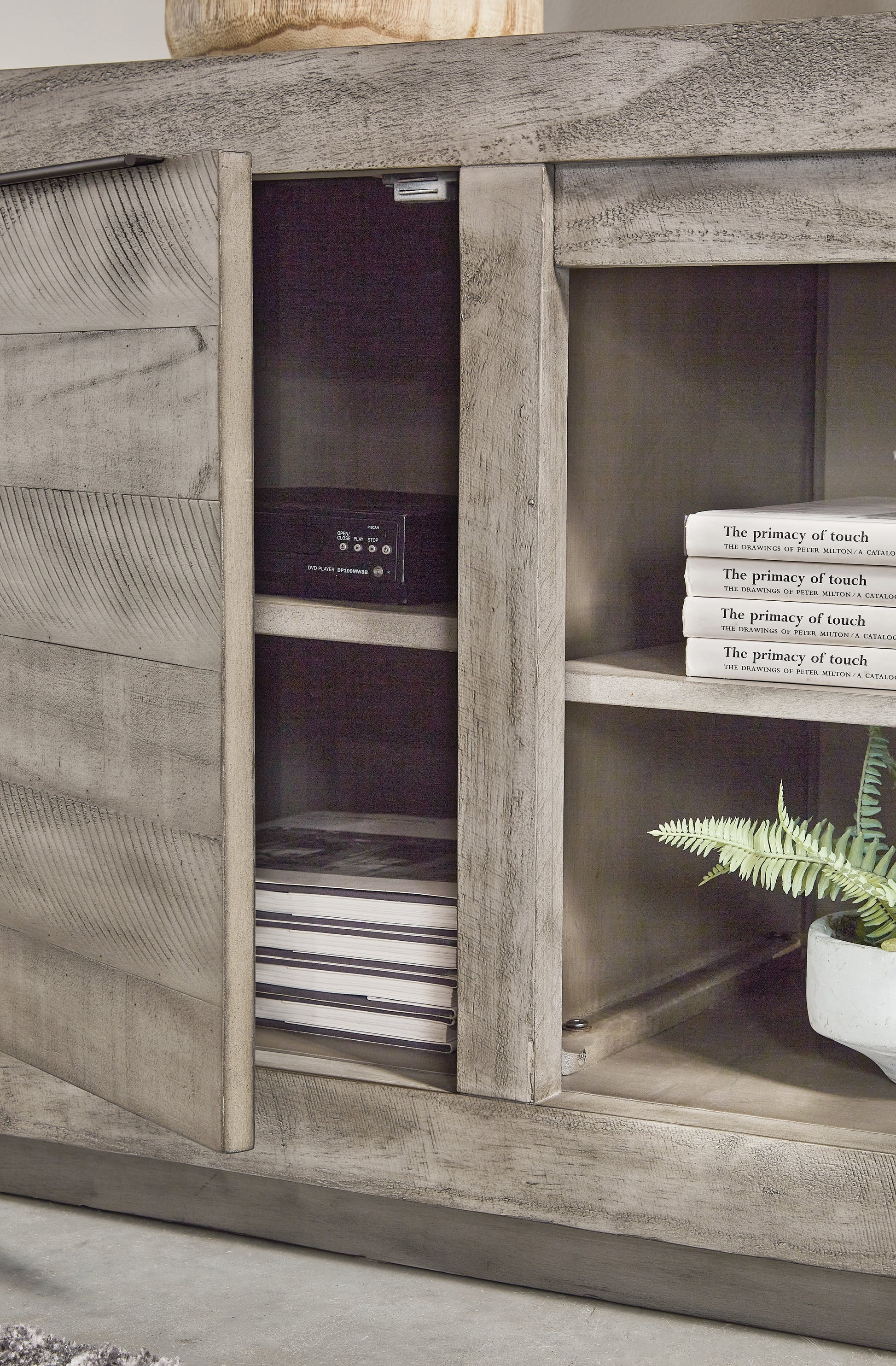 Balancing chic flair with a relaxed sensibility, this extra-large TV stand strikes just the right tone for rustic sophistication. Beautifully clean lines are subtly enhanced with relaxed distressing and saw marks for authentic barn wood character. You're sure to love the convenient open style for easy access to media equipment and accommodating pretty home accents.