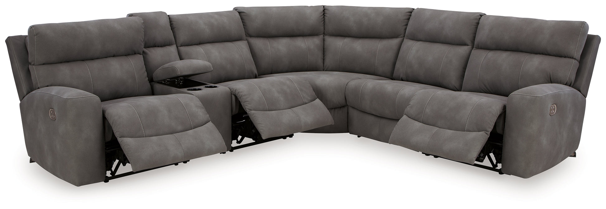 - Includes 6 modular pieces: left-arm facing power recliner, armless chair, wedge, console with storage, power armless recliner and right-arm facing power recliner