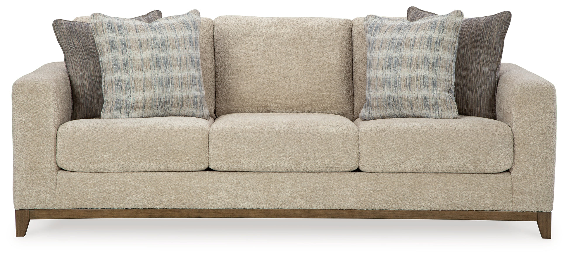 Serene style with a modern sensibility. Delight in the cozy, versatile embrace of this sofa. It takes an on-trend approach to irresistible texture and natural beauty, showcasing soft upholstery accented with a transitional wood trim. As refined as it is laid back, the sofa also keeps comfort a priority with plush, thick seat cushions.