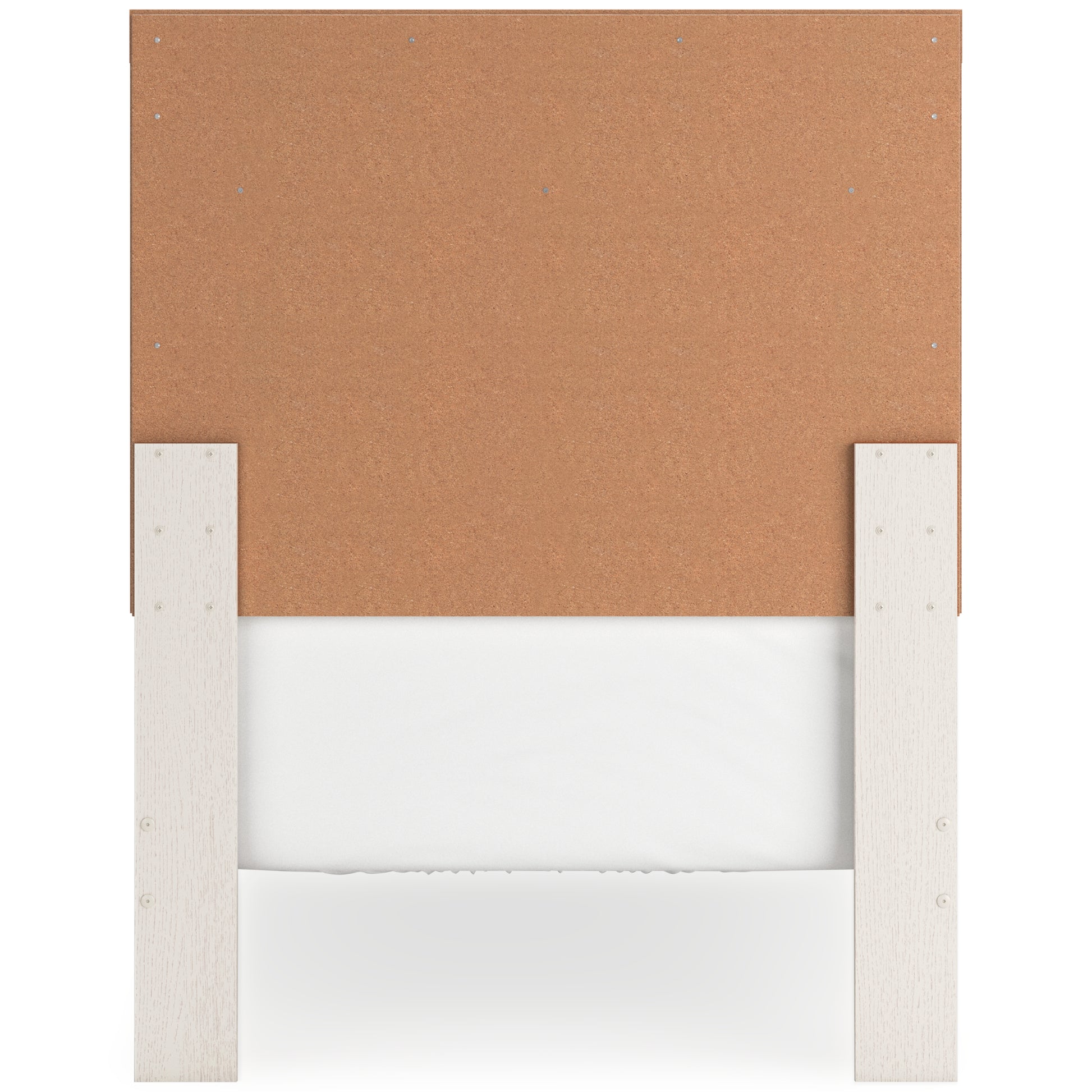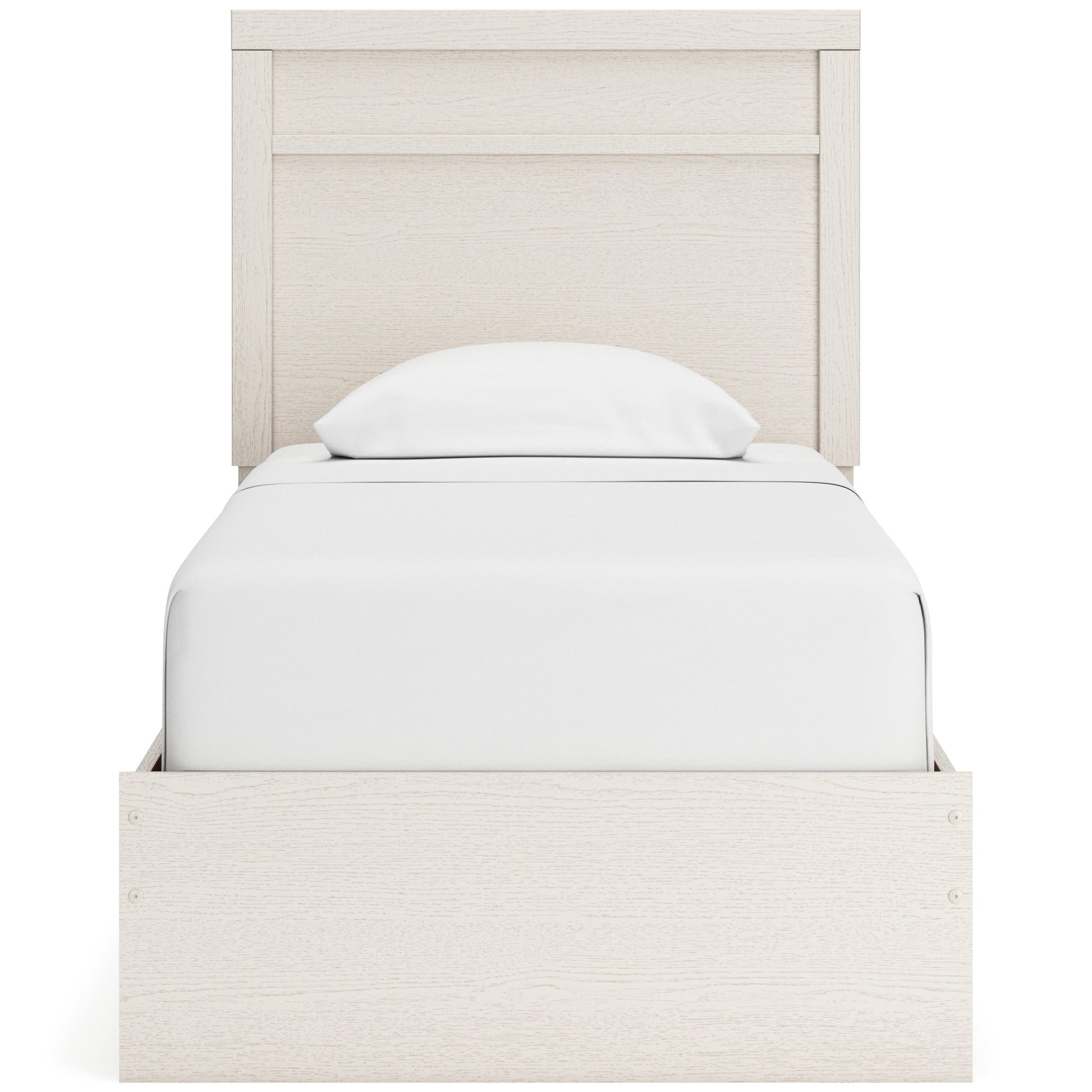With its clean-lined look and modern attitude, this panel bed is a fresh style awakening. A crisp, white hue over subtle replicated wood grain easily complements other furniture finishes. Its simple, unadorned profile is given depth and dimension with the addition of plank-style moulding on the headboard—proof that beauty lies in the details.